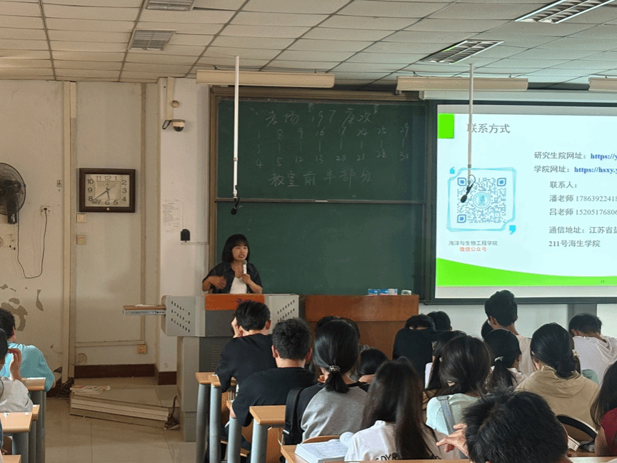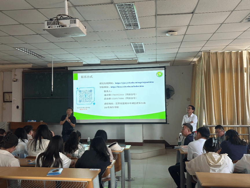 潘明珠博士通过PPT介绍了盐城、盐城工学院及海生学院的基本情况,详细解读了海生学院生物与医药(专业代码:086000)、食品与营养(专业代码:095500)专业学位点的考试科目、奖学金构成及研究生的居住和学习环境。吕永梅博士以第一届学姐的身份为同学们分享了考研的目的,自我定位和考研复习方法等经验。高留才针对学生为什么要考研,考研怎么择校,为什么要考盐城工学院等问题为学生作了详细的推介。齐志涛就报考盐城工学院“生物与医药”和“食品与营养”两个专业硕士的具体问题和注意事项,为在场学生作了详细的解读。彭斌结合盐城的四色文化——蓝色海洋经济、绿色生态湿地、红色铁军精神、白色海盐文明,介绍了学校的区域优势和地域特色,并热情欢迎生工院的学生报考海生学院研究生。