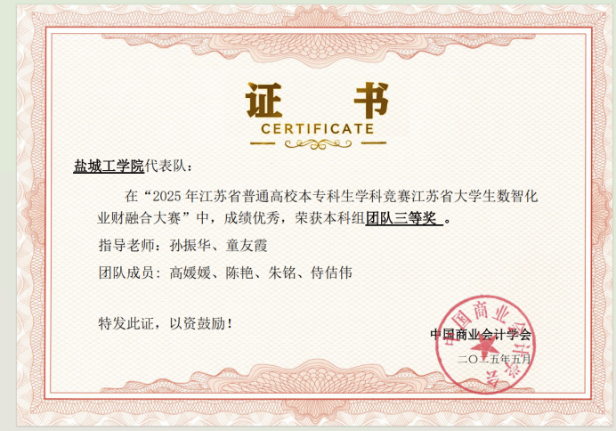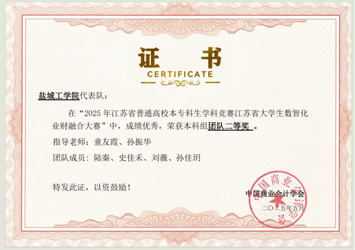 在刚刚落幕的2025年全国大学生数智化业财融合竞赛中,我校经济管理学院学子表现优异,D会计221班刘薇、陆秦、孙佳玥、史佳禾等四位同学组成的团队获得全国总决赛三等奖,区域赛二等奖以及本科组团队一等奖的佳绩,G经管221班高媛媛、陈艳、朱铭、侍佶伟等四位同学组成的团队获得区域赛三等奖的佳绩,本次获奖队伍由会计学系童友霞、孙振华两位教师指导,比赛结果充分展现了经管学院学生在业财融合领域扎实的专业知识和创新的数智化应用能力。