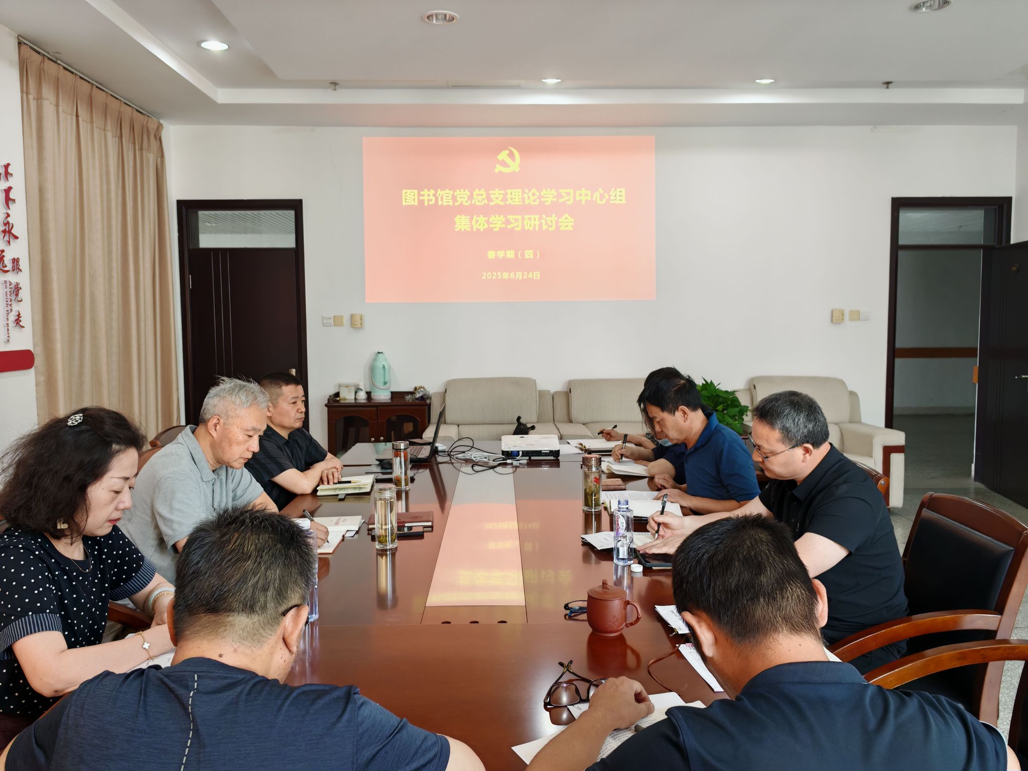 6月24日下午,在南校区图书馆D805会议室,图书馆党总支理论学习中心组开展春学期第四次集体学习研讨,党总支书记花爱军主持会议,中心组全体成员参加。