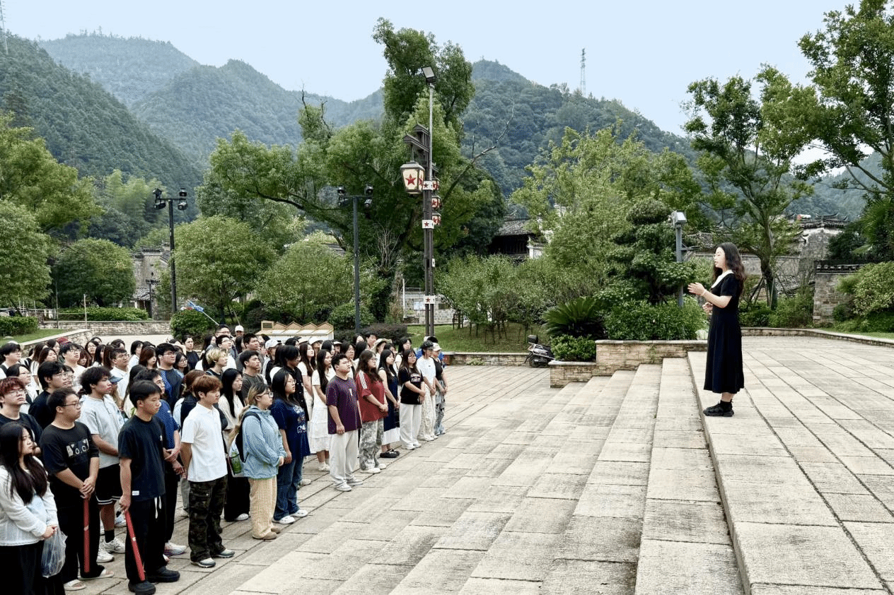 戴心怡则以“瑶里改编:烽火中的信念传承”为题,为师生们带来沉浸式思政课。她在纪念碑前用生动的语言讲述新四军瑶里改编的动人故事,告诉现场师生瑶里的红色文化从来不是陈列的历史,而是指引前行的精神火炬。她指出,人生的方向,要与国家的需要同频;生命的意义,要在责任担当中彰显。她勉励同学们要深入学习革命先辈的奋斗精神,厚植家国情怀,在实践中坚定理想信念、锤炼品德修养。