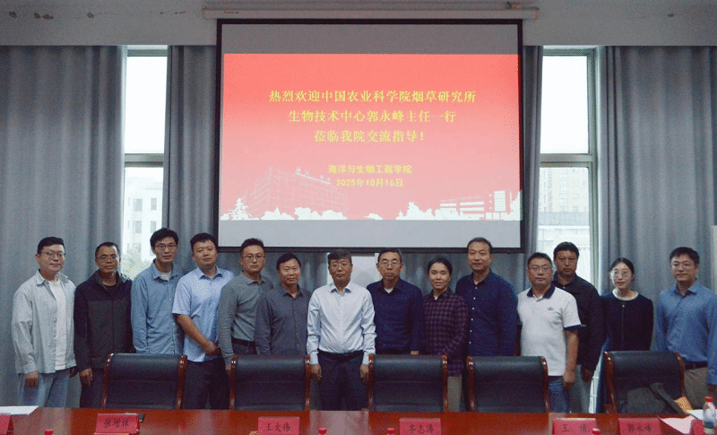 10月16日,由中国农业科学院烟草研究所生物技术研究中心主任郭永峰、副主任王大伟带队,研究员王倩,副研究员张增林、代常波以及博士宋士健、吴启等一行7人来我校海洋与生物工程学院,面向生物医药领域的前沿进展、科研项目合作和联合培养研究生进行学术交流与合作洽谈。党总支书记高留才、院长彭斌、副院长齐志涛,副教授封功能、魏畅、熊敏,博士张楷歆、顾晓天和全体在校研究生参加。会议由齐志涛主持。