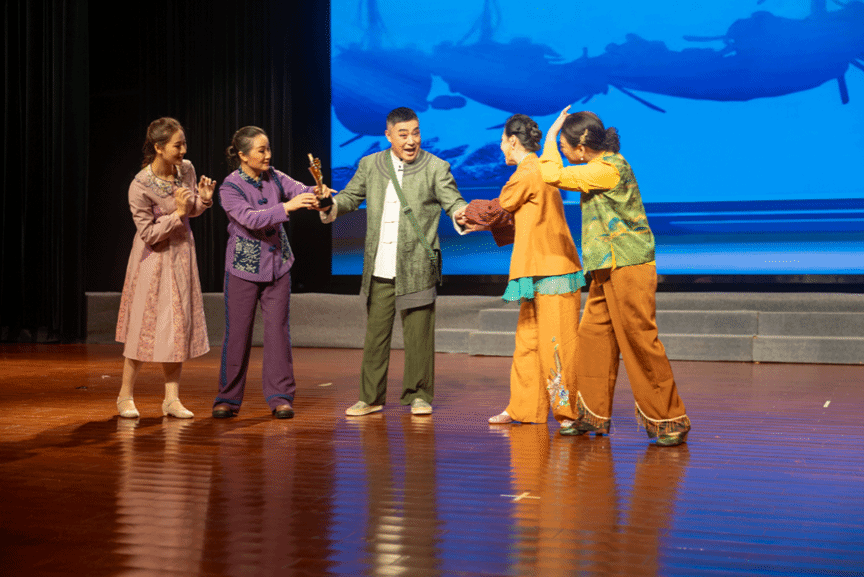 演出当晚,报告厅内座无虚席,师生们怀着期待的心情迎接这场文化盛宴。伴随着“我家住在渔歌村,渔歌声里有知音。苦辣酸甜唱不尽,唱得月落太阳升……”的悠扬唱段,剧情缓缓展开:老渔民“笑开怀”数十年热爱渔歌、与渔歌难舍难分;渔村兴建渔歌小镇的机遇下,民间渔歌艺术团却面临解散危机;为守护渔歌这一文化瑰宝,“笑开怀”主动担起渔歌小镇文化站代副站长职责,带领大家为传承渔歌奔走……轻喜剧的呈现形式让乡村故事更具亲和力,演员们生动的表演、婉转的唱腔,将“一首渔歌牵起一个村、连着一群人”的温情与坚守展现得淋漓尽致,台下不时响起阵阵掌声与喝彩声。