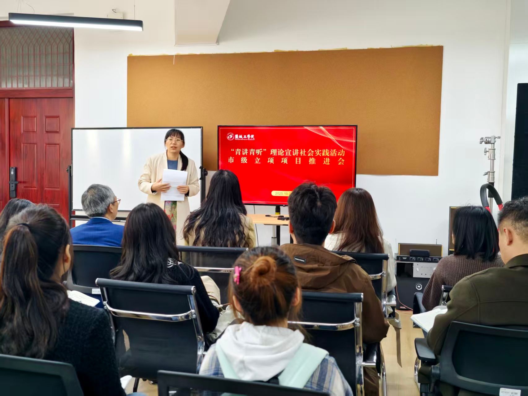 10月29日下午,盐城工学院网络思政中心在希望大道校区仁和楼融媒体中心会议室,专题召开“青讲青听”理论宣讲社会实践活动市级立项项目推进会。党委常委、宣传部部长奚新国出席会议并讲话,各市级立项项目指导教师及学生团队负责人参会,共同为项目高质量推进凝聚共识、明确路径。