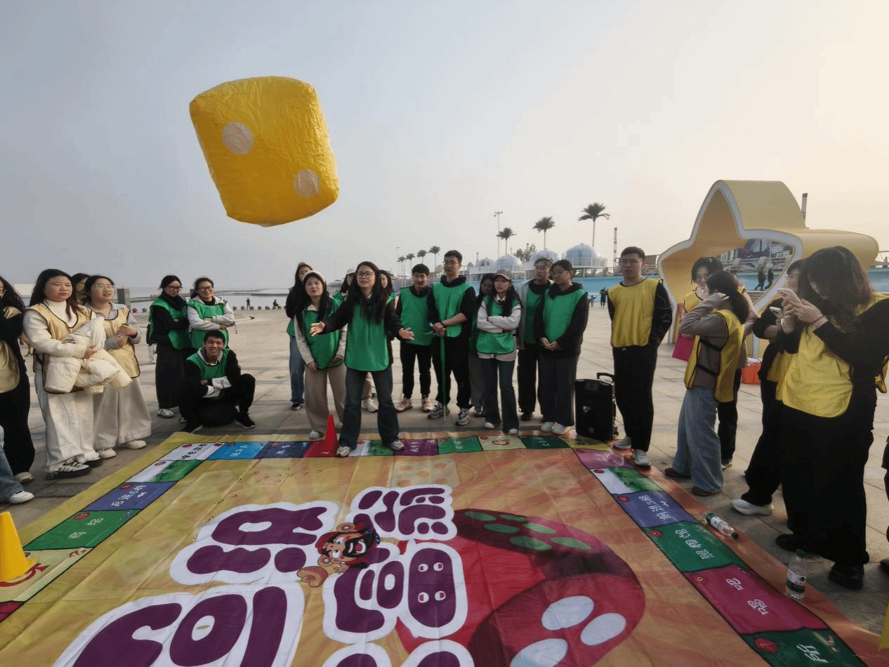 在滨海月亮湾,师生瞻仰了宋公堤,聆听红色故事,传承爱国情怀与红色精神。随后通过开展“真人大富翁”项目,四个队伍凭借2000元虚拟启动资金,通过掷骰子移动、完成任务、购买经营资产等环节展开比拼,在趣味互动中培养了策略思维与团队协作意识。