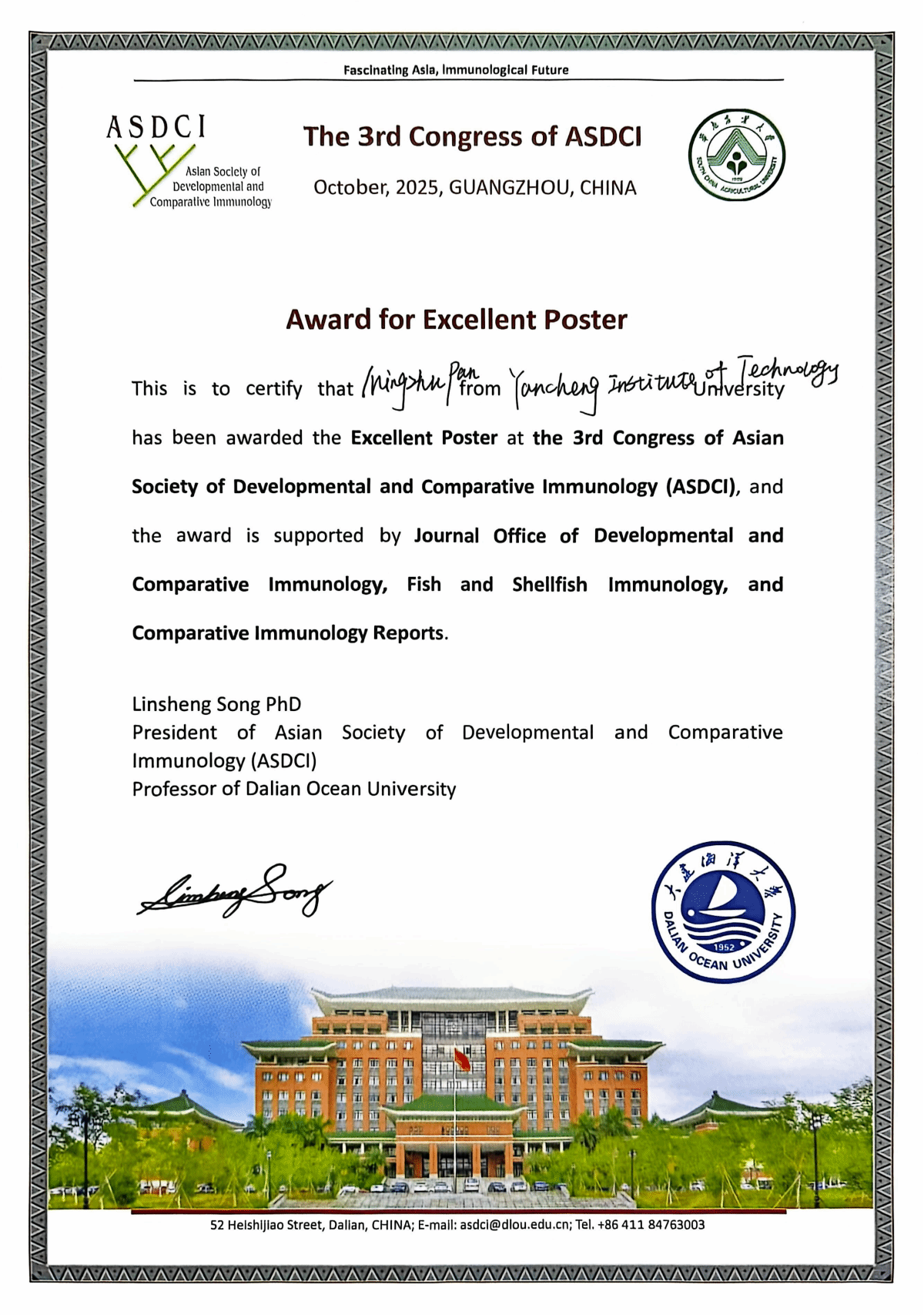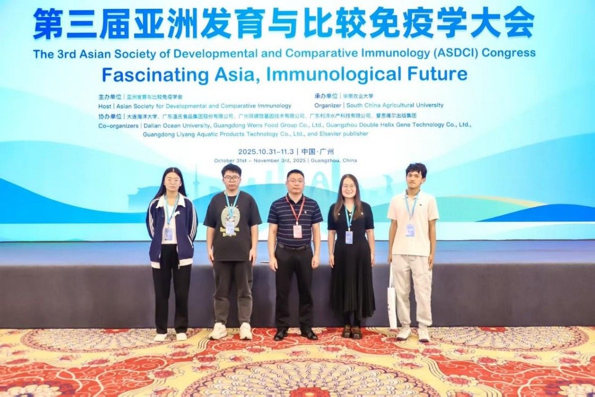10月31日-11月3日,以“Fascinating Asia, Immunological Future”为主题的第三届亚洲发育与比较免疫学大会(The 3rd Asian Society of Developmental and Comparative Immunology (ASDCI) Congress)在广州召开。海生学院齐志涛教授受邀担任“Adaptive Immunity and Vaccines”分论坛主持。团队科研成果展示荣获“最佳墙报奖”。本次大会为亚洲乃至全球免疫学者提供了高水平的交流平台,展现了亚洲在免疫学研究领域的巨大潜力与独特魅力,进一步推动了水产动物领域理论和技术创新。