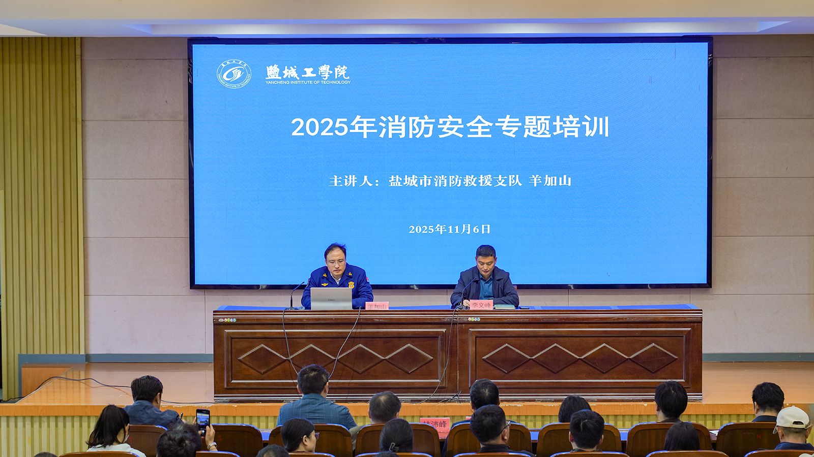 为深入贯彻全省、全市消防宣传月活动的工作要求,切实提升全校师生消防安全意识,提高应急避险与自救互救能力,筑牢校园安全“第一道防线”,11月6日上午,学校邀请市消防救援支队法制科科长羊加山作专题消防安全培训。培训活动由安保处处长李义峰主持,后勤服务集团总经理潘文东、副总经理岳红印,学生处副处长马晓英,安保处副处长林沛峰等出席活动,后勤服务集团员工、实验室专任教师、学工办主任、安保人员及学生代表320余人参加活动。