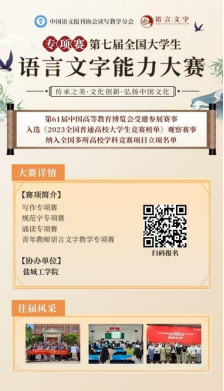 为深入贯彻国家语言文字工作方针政策,我校将通过第七届全国大学生语言文字能力大赛专项赛推动中华优秀传统文化传承,全面提升在校学生语言文字应用能力与文化素养。经研究,现将2025年第七届全国大学生语言文字能力大赛专项赛(写作、规范字、诵读)报名事宜通知如下: