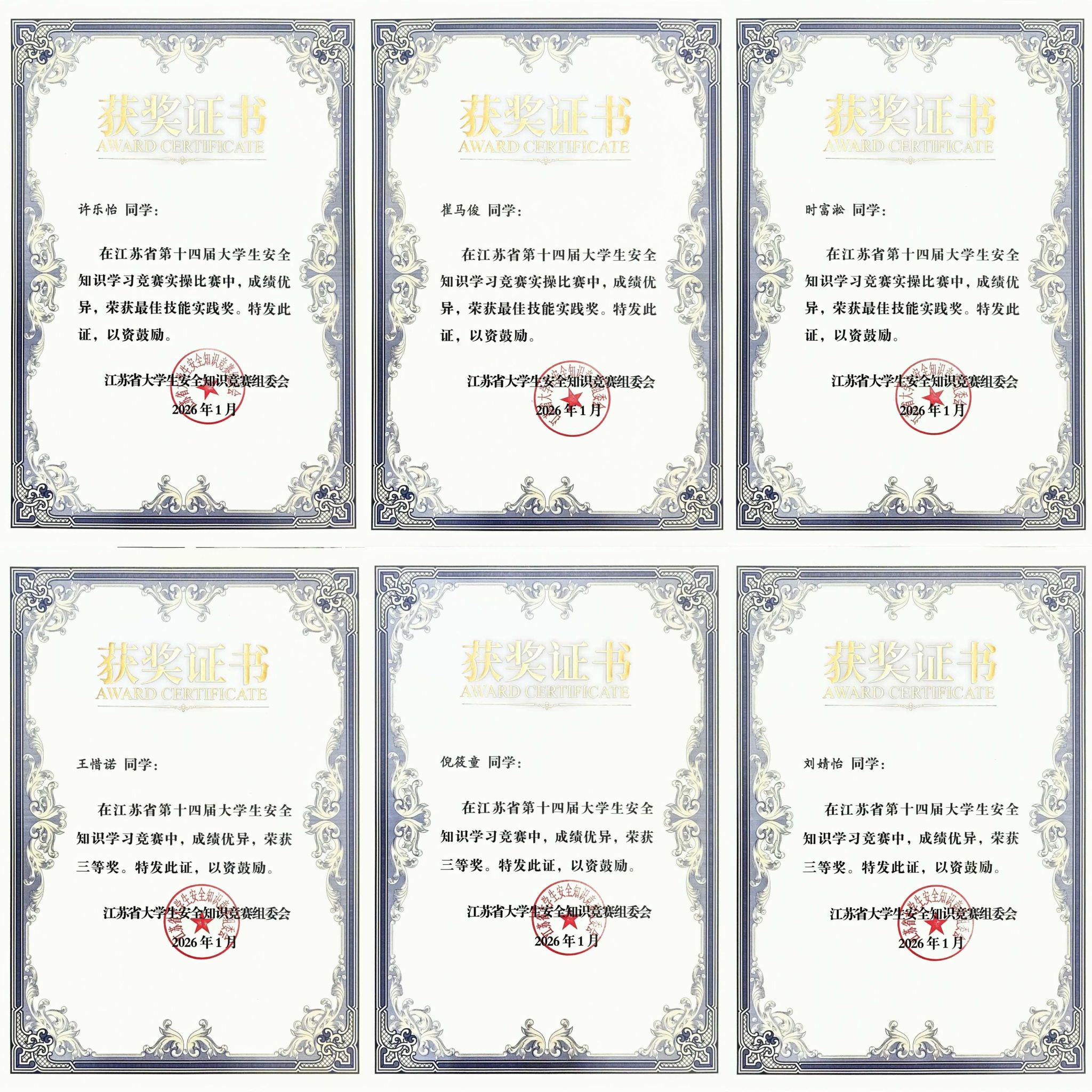 日前,江苏省第十四届大学生安全知识学习竞赛结果公布,由我校安全保卫处李义峰、陆亮指导,汽车工程学院2025级许乐怡、崔马俊、时富淞等3名学生组成的代表队在安全技能实操比赛中获本科组团体总分第九名并荣获“最佳技能实践奖”。由安全保卫处陈卫嵘、俞曙阳指导,电气工程学院2025级王惜诺、纺织服装学院2025级倪筱童、汽车工程学院2025级刘婧怡等3名学生组成的代表队在安全知识学习竞赛中荣获三等奖。