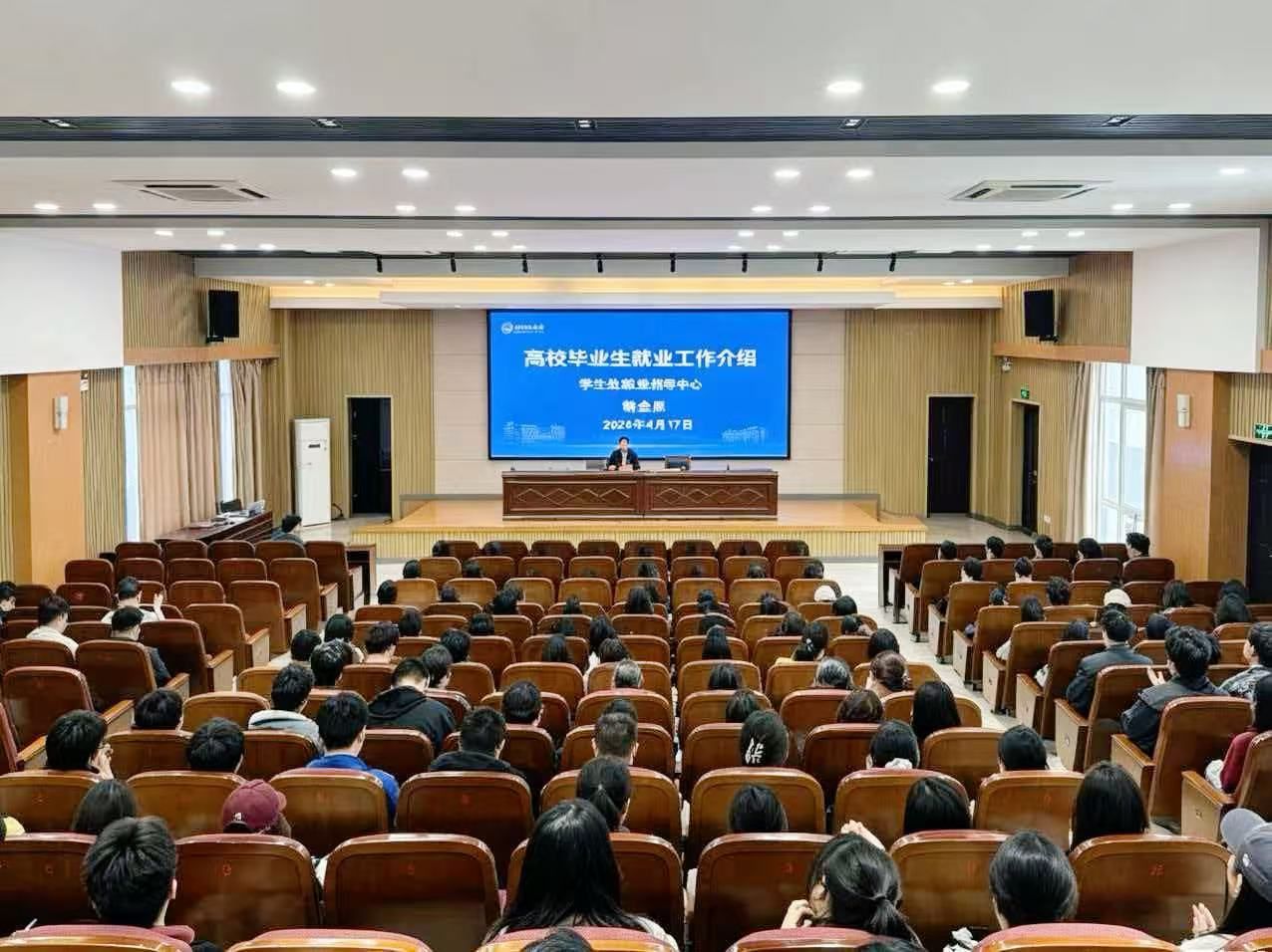 为进一步做实做细毕业生就业指导工作,引导2026届毕业生树立科学理性的就业观念,提升求职核心竞争力,切实回应并解决同学们在求职就业过程中遇到的实际困惑,4月17日下午,人文学院在南校区机械馆报告厅举办2026届毕业生就业专题指导讲座。本次讲座特邀学校就业创业指导中心主任韩金原主讲,由人文学院学工办主任魏语婷主持,毕业班辅导员及全体2026届毕业生参加。