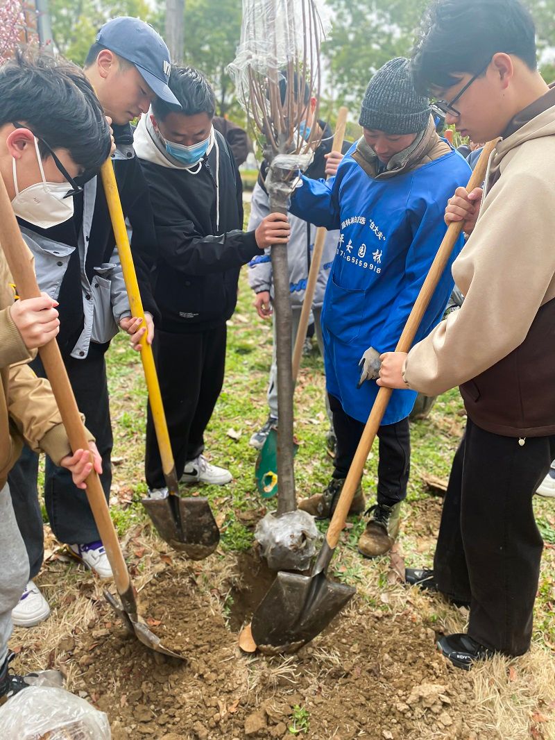 植树活动现场,校后勤服务集团为同学们提供了铁铲、水桶等植树工具,同学们在工作人员的指导下展开劳动。大家既有分工又有协作,严格按照流程认真细致地挥锹挖土、扶苗填坑、夯土浇水,充分发扬不怕苦、不怕累的精神,干劲十足,热情高涨。B服装222班的王佳雯表示,“一年之计在于春,亲手种一棵树,就是把自己的一片情意种在了这里”;B环艺221班的陈博林感叹道,“在大一我们一起种下树苗,等大四甚至毕业后,我们还可以在植树节相聚于此,我觉得这是个很有意义的活动”。随后,大家在栽种好的树苗前合影留念,并在润美楼前拍摄年级合照;部分大二学子也在活动当天前来看望去年种下的小树苗,并为其除草、浇水、施肥;还有一些班级开展特色团日活动,在树苗周围栽种多肉植物。