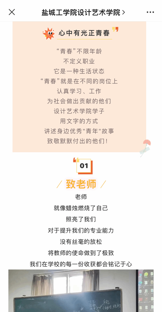 展奋斗之姿,讲述青春故事。“青年”不分年龄、职业的限定,每一位拼搏的奉献者都是“青年”,为发挥榜样教育力量,5月2日至4日期间,设计艺术学院在微信公众平台开展“讲述身边优秀‘青年’故事”征集活动,同学们踊跃投稿,分享专业课老师、辅导员、志愿者等青年代表的奋斗故事,感受努力奔跑、敢于追梦的青春力量。B产品212班邓杨在活动后表示,不管是什么年龄段的人,都在各行各业被激励着不断前进,如今的薪火传递到我们手中,我们要主动担当,全力以赴,用一份合格的答卷,致青春、致祖国、致吾辈!