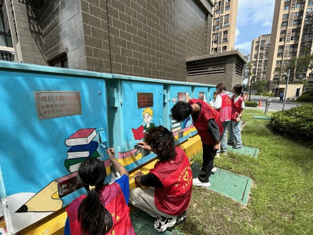 实践团成员不畏室外接近40度的高温酷暑,在课堂与户外之间来回奔波,用一周的时间为社区绘制主题彩绘。彩绘内容包括书香社区、和睦邻里、卡通形象等,成员们用自己的双手和画笔,描绘出了平安家园、和谐邻里的美好图景,为社区增添了一道亮丽的风景线。活动过程中,成员们分工明确,从选图、起形、上色到精修,每一个步骤都有条不紊,他们手拿刷子,调颜料、勾轮廓、涂色彩,反复打磨每一幅画面,认真勾勒每一个细节,精益求精绘制艺术作品。在全体实践团成员的努力下,一幅幅生动的作品将原本斑驳的配电箱、路障石墩、墙面“改头换面”,社区居民对实践团所创作出的彩绘作品纷纷竖起了大拇指。