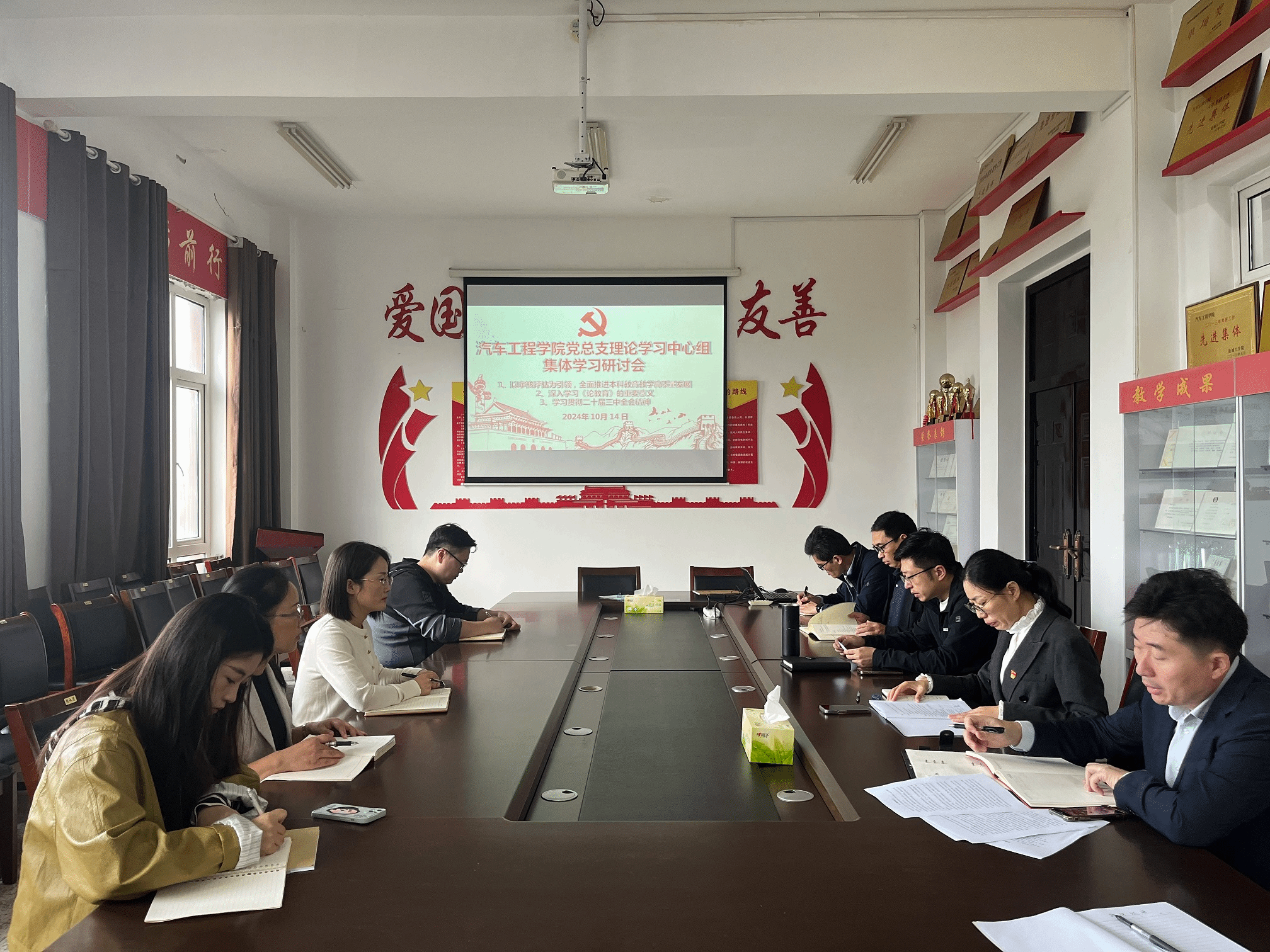 10月14日上午,汽车工程学院党总支理论学习中心组在机械馆A323会议室举行集体学习研讨会,学习研讨如何以审核评估为引领,全面推进本科教育教学高质量发展、深入学习《论教育》的重要意义以及如何做好党的二十届三中全会精神的学习宣传贯彻,推动全会精神落地见效。学院党总支书记陈青主持,理论学习中心组全体成员参加。