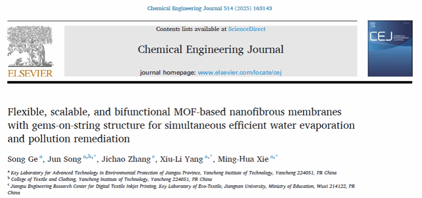 近日,以我校硕士研究生葛淞同学为第一作者,江苏省新型环保重点实验室宋骏博士、解明华及杨秀丽教授为通讯作者,盐城工学院为唯一通讯单位的研究论文Flexible, scalable, and bifunctional MOF-based nanofibrous membranes with gems-on-string structure for simultaneous efficient water evaporation and pollution remediation在材料、化工领域一区TOP期刊Chemical Engineering Journal上发表(该刊2024年影响因子为13.4)。