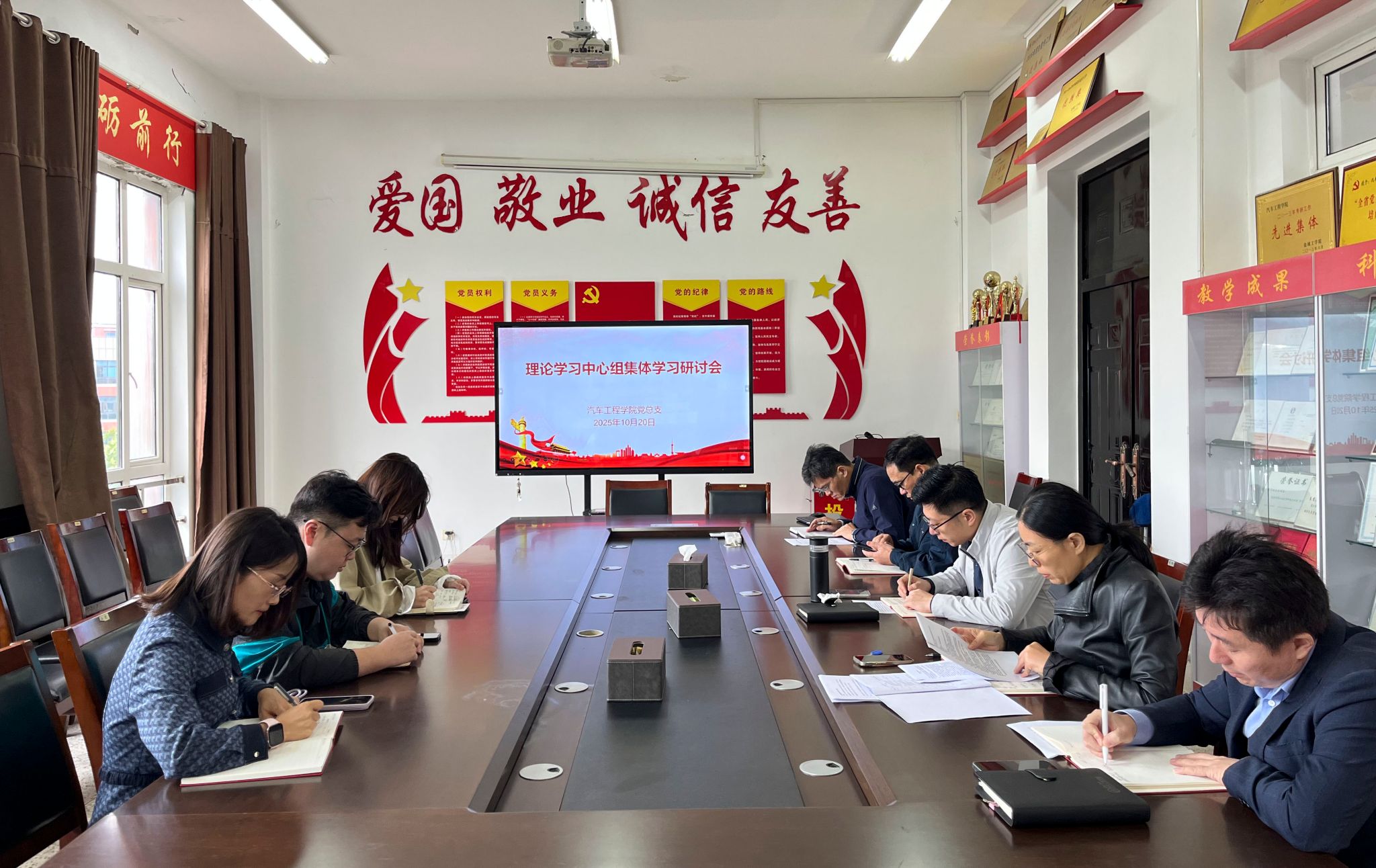 10月20日上午,汽车工程学院党总支理论学习中心组在机械馆A323会议室举行2025年秋学期第二次集体学习研讨会,学习习近平总书记在纪念中国人民抗日战争暨世界反法西斯战争胜利80周年大会上的重要讲话精神、习近平总书记重要文章《健全全面从严治党体系》,党总支书记陈青主持,党总支理论学习中心组成员参加。